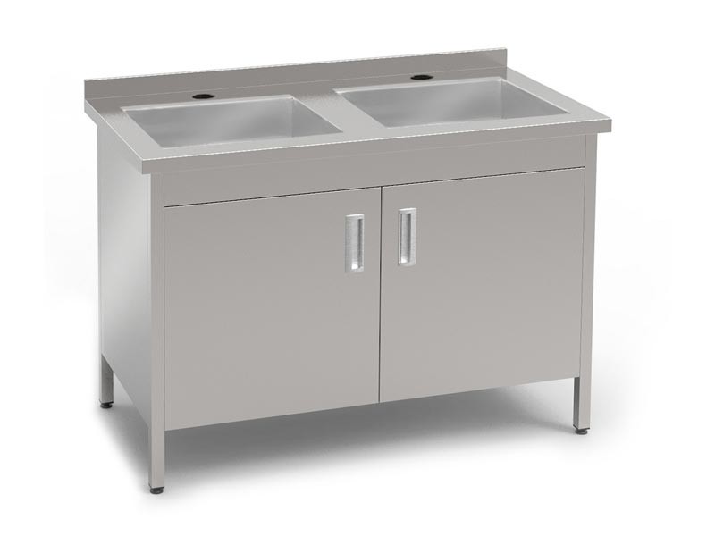 Мийка-тумба з нержавіючої сталі, 2-х секційна, закрита з трьох сторін. Глибина ванни: 300 мм.